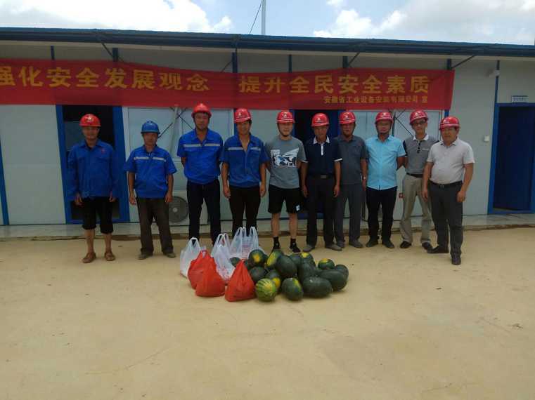 烈日炎炎,酷暑難當(dāng),6月28日上午,安裝安裝第四分公司經(jīng)理趙永峰在分公司副經(jīng)理姜田斌,工程科、安全科負(fù)責(zé)人的陪同下,來到廣東省清遠(yuǎn)市印染行業(yè)污水處理項目,看望和慰問奮戰(zhàn)在一線的員工,為他們送去綠豆、白糖、西瓜、藿香正氣水、十滴水、仁丹等防暑降溫物品,實地察看了項目工地和職工生活區(qū),并與項目同志進(jìn)行了座談交流 。
