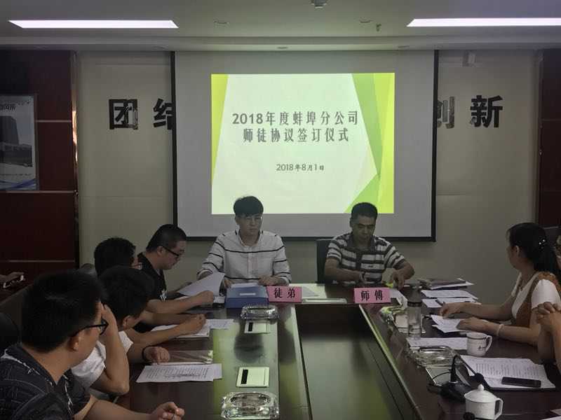 為了加快人才培養(yǎng),促進崗位成才,2018年8月1日下午,蚌埠分公司舉辦了一場隆重的師徒協(xié)議簽訂儀式。分公司機關(guān)全體員工及項目部代表出席會議。會議由分公司工會主席程茂麗主持。