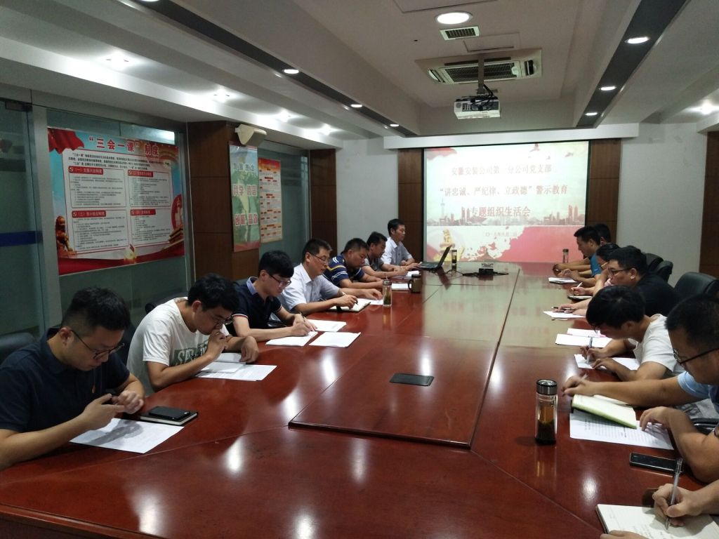 8月2日下午,第一分公司黨支部在分公司機關會議室召開了“講忠誠、嚴紀律、立政德”警示教育專題組織生活會。公司總會計師張元斌、黨委辦公室楊駿輝到會指導。第一分公司黨支部書記胡迎東主持會議,分公司領導班子成員、支部全體黨員參加會議。