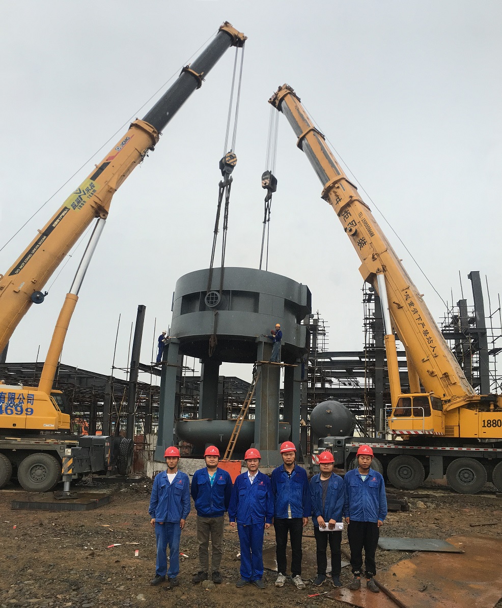 本次吊裝的反應(yīng)器中段部分重達(dá)220噸,分公司領(lǐng)導(dǎo)高度重視,吊裝前期,邀請(qǐng)公司總工吳繼成、總工辦主任牛守義和安全部王岳濤經(jīng)理親臨項(xiàng)目部參與設(shè)備吊裝的專題方案討論定稿工作。當(dāng)日上午,吊裝現(xiàn)場(chǎng)準(zhǔn)備工作緊張卻又有條不紊的進(jìn)行,項(xiàng)目經(jīng)理李子鳳向全體“參戰(zhàn)”員工進(jìn)行了安全交底,工作人員對(duì)兩臺(tái)分別為500T、350T吊車的站位及性能再次確認(rèn),現(xiàn)場(chǎng)機(jī)具、人員均按既定方案實(shí)施。分公司經(jīng)理史崇松、業(yè)主單位負(fù)責(zé)人、監(jiān)理全程在現(xiàn)場(chǎng)“督戰(zhàn)”,全體工作人員經(jīng)過(guò)四個(gè)小時(shí)的奮戰(zhàn),吊裝作業(yè)圓滿結(jié)束。
