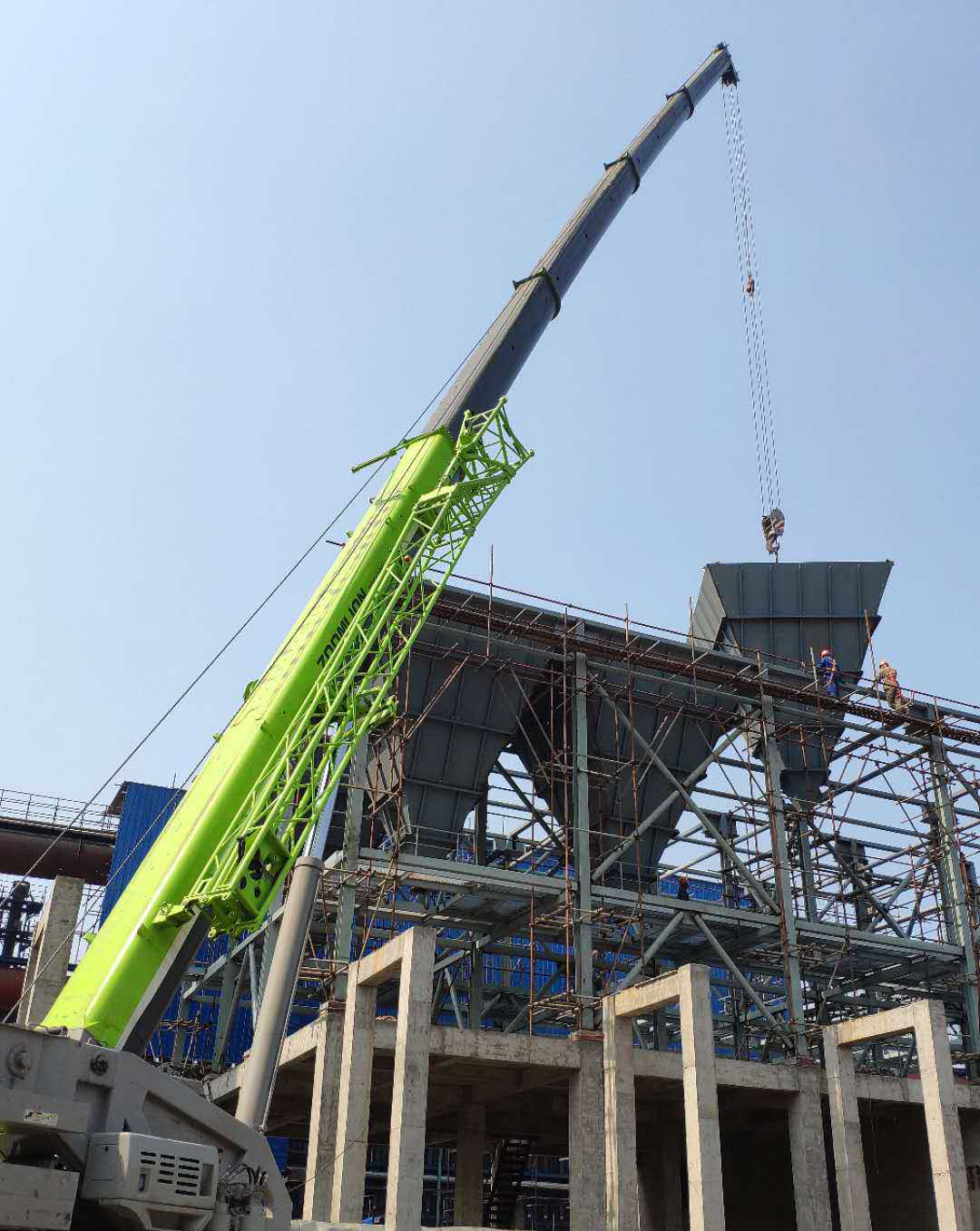 本次吊裝的反應(yīng)器灰斗部分總重量達(dá)56噸,吊裝作業(yè)存在場地狹小、與土建單位交叉作業(yè)多、吊重荷載大等諸多困難,吊裝任務(wù)異常艱巨。為此,項目部提前合理部署,多次優(yōu)化吊裝方案,按照方案要求采用額定荷載為100噸的汽車實施吊裝作業(yè)。項目部在設(shè)備吊裝前對全體“參戰(zhàn)”人員進(jìn)行了現(xiàn)場安全技術(shù)交底,明確施工工序、技術(shù)要點難點和安全風(fēng)險點,做到分工明確、責(zé)任到位,吊裝工作有條不紊地展開。在各方力量的通力配合下,經(jīng)過六個多小時的奮戰(zhàn),項目部終于完成了10臺灰斗以及現(xiàn)場輔助設(shè)備的吊裝任務(wù)。