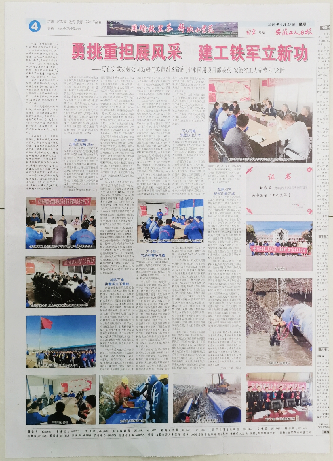 先進典型是時代精神的標桿,典型事跡報道是擴大傳播力的有效法寶。近日,《安徽工人日報》在風采專版的顯著位置以《勇挑重擔展風采,建工鐵軍立新功》為題刊發(fā)整版專題報道,記述安徽安裝新疆烏蘇市西區(qū)管廊、中水回用項目部榮獲“安徽省工人先鋒號”的典型事跡以及項目部團隊的幕后故事。