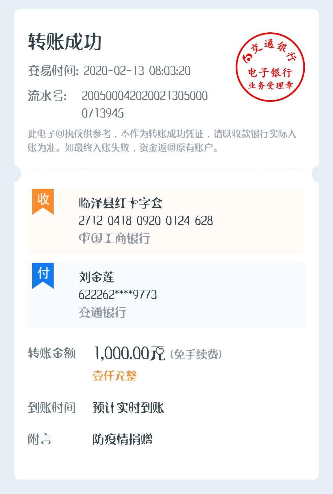 她就是寧夏辦事處職工劉金蓮?fù)?。劉金蓮?fù)驹诠ぷ髦姓J真積極,是一名陽光樂觀、任勞任怨的優(yōu)秀員工,她在平時生活工作中也總是積極主動的幫助他人。在這次疫情爆發(fā)后,2月13日,劉金蓮?fù)局鲃勇?lián)系當?shù)馗拭C省臨澤縣紅十字會,通過線上微信轉(zhuǎn)賬的方式,轉(zhuǎn)給紅十字會捐款人民幣1000元。接下來,她又主動聯(lián)系當?shù)丶t十字會工作人員,要求主動擔(dān)當志愿者,但是因為客觀原因,沒有被批準。