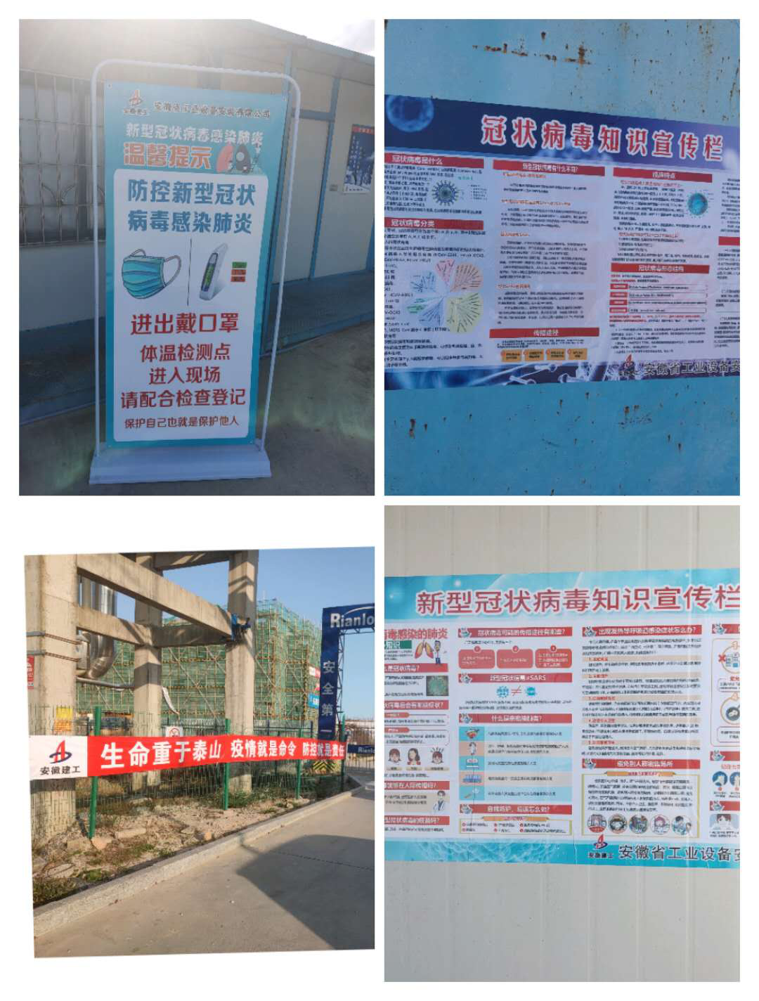 一是編制方案。根據(jù)公司《安徽安裝公司工程項(xiàng)目疫情防控期間復(fù)工工作須知》要求,項(xiàng)目部編寫(xiě)了疫情防控方案和應(yīng)急預(yù)案,確保做到“七個(gè)到位”:防控機(jī)制到位、員工排查到位、設(shè)施物資到位、內(nèi)部管理到位、宣傳教育到位、安全生產(chǎn)到位、信息報(bào)送到位,確保復(fù)工機(jī)制健全到位。