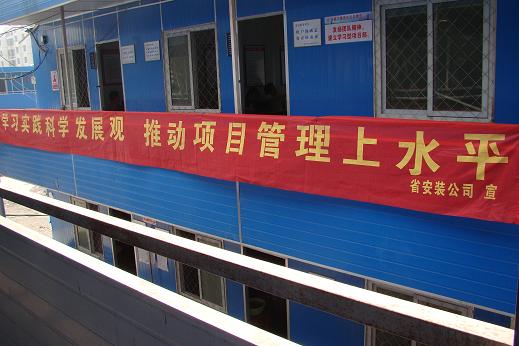 省政務(wù)服務(wù)中心及綜合樓和合肥中心醫(yī)院項(xiàng)目屬省、市重點(diǎn)工程之一。由多家大中型施工企業(yè)共同承建。我公司承擔(dān)的安裝工作量分別在1582萬(wàn)和2800萬(wàn)以上,是具有相當(dāng)規(guī)模和社會(huì)影響的工程項(xiàng)目。合肥項(xiàng)目黨支部在開(kāi)展第二批實(shí)踐科學(xué)發(fā)展觀活動(dòng)中,因地制宜地開(kāi)展宣傳活動(dòng)。分別在這兩個(gè)項(xiàng)目施工現(xiàn)場(chǎng)懸掛了《深入開(kāi)展學(xué)習(xí)實(shí)踐科學(xué)發(fā)展觀活動(dòng)》和《學(xué)習(xí)實(shí)踐科學(xué)發(fā)展觀推動(dòng)項(xiàng)目管理上水平》的橫幅標(biāo)語(yǔ)。目前是整個(gè)施工現(xiàn)場(chǎng)開(kāi)展學(xué)習(xí)實(shí)踐科學(xué)發(fā)展觀活動(dòng)中唯一在現(xiàn)場(chǎng)宣傳的一家施工企業(yè)。