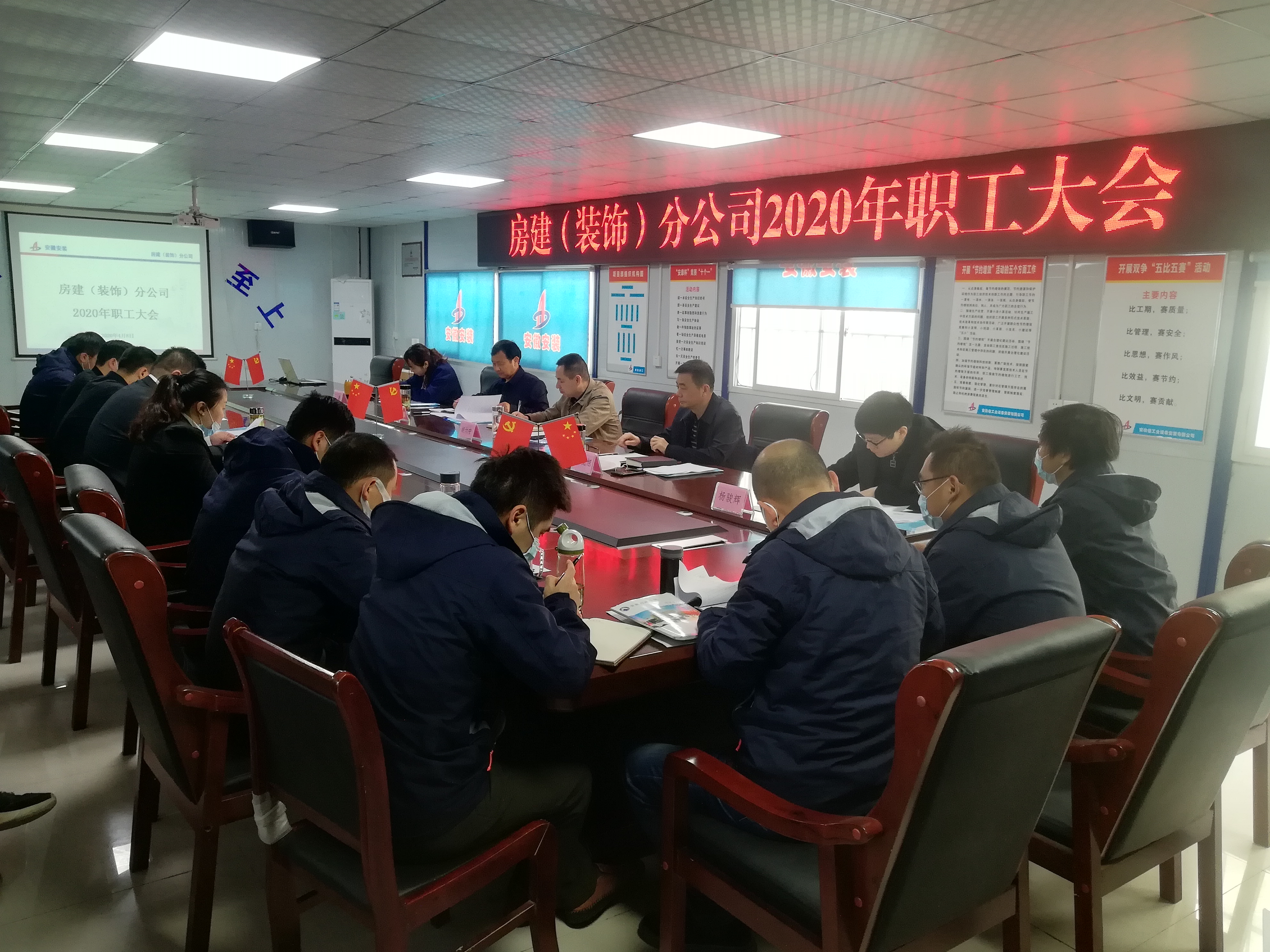 4月8日上午,安徽安裝公司房建(裝飾)分公司在阜陽市潁東區(qū)中醫(yī)院建設(shè)PPP項(xiàng)目部召開2020年職工大會(huì)。公司黨委書記、董事長(zhǎng)胡六中,副總經(jīng)理高飛,紀(jì)委書記、工會(huì)主席李寬旭出席大會(huì),人力資源部負(fù)責(zé)人及黨辦相關(guān)人員、分公司班子成員及機(jī)關(guān)、阜陽市潁東區(qū)中醫(yī)院建設(shè)PPP項(xiàng)目、淮北恒基城項(xiàng)目部分員工參加會(huì)議。會(huì)議由分公司黨支部副書記張曼主持。