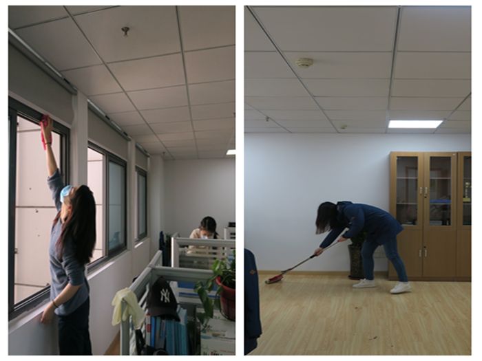 風(fēng)和日麗,大家早早的來到辦公室,三五一組,相互配合,擼起袖子加油干。開窗通風(fēng)、地面清掃、消毒殺菌、門窗擦拭、書柜整理、綠植澆灌、垃圾傾倒……大家熱情高漲、干勁十足,仔仔細(xì)細(xì)清理著每個角落,不遺漏任何一個死角。經(jīng)過半個多小時的辛勤勞動,辦公區(qū)域頓時變得更加清新明亮、干凈整潔,不由得令人耳目一新、賞心悅目。隨后,分公司文明衛(wèi)生檢查組還對各部門的衛(wèi)生情況進(jìn)行了嚴(yán)格打分,并對檢查結(jié)果進(jìn)行了通報。