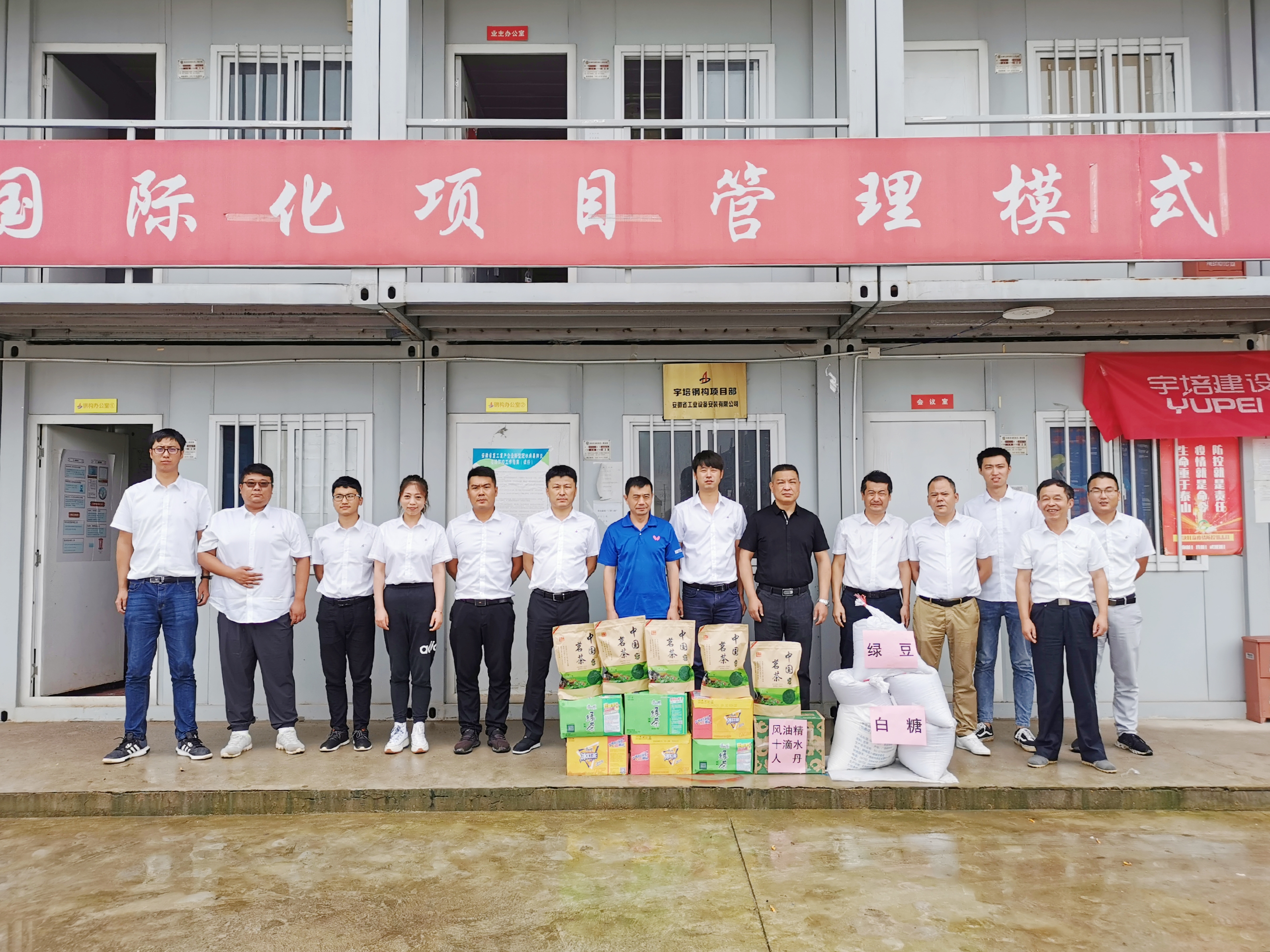 7月17日上午,公司領(lǐng)導(dǎo)走訪慰問(wèn)了合肥分公司蕪湖宇培鋼結(jié)構(gòu)項(xiàng)目部,為高溫天氣堅(jiān)守在工作一線的項(xiàng)目部員工帶來(lái)了夏日防暑的常用藥品及飲料、綠豆、白糖、茶葉等。要求項(xiàng)目部堅(jiān)持以人為本,一定要做好常態(tài)化疫情防控、防暑降溫、雨期安全工作,尤其是高溫、大風(fēng)等極端天氣更要精心部署,合理安排作業(yè)內(nèi)容,避開(kāi)高溫時(shí)段施工,每日班前做好員工精神狀態(tài)確認(rèn),安全提醒到位,確保高溫季節(jié)一線職工安全度暑。