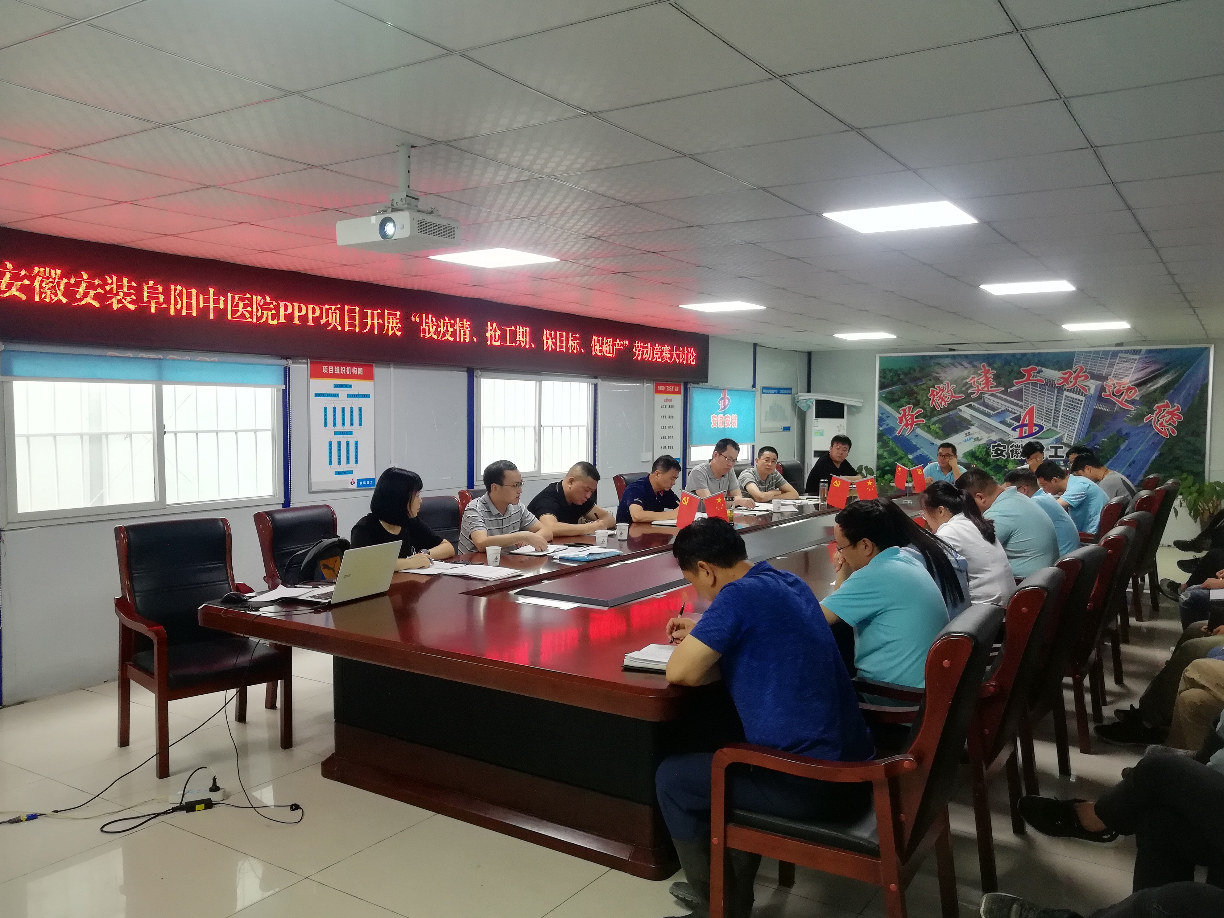 為認真貫徹公司“戰(zhàn)疫情、搶工期、保目標、促超產(chǎn)”勞動競賽活動精神,7月12日下午,公司紀委書記、工會主席李寬旭,副總經(jīng)理王軍一行在阜陽潁東中醫(yī)院建設PPP項目部會議室,組織開展“戰(zhàn)疫情、搶工期、保目標、促超產(chǎn)”勞動競賽大討論,分公司領導班子成員、項目部全體人員30余人參加了會議,會議由李寬旭主持。