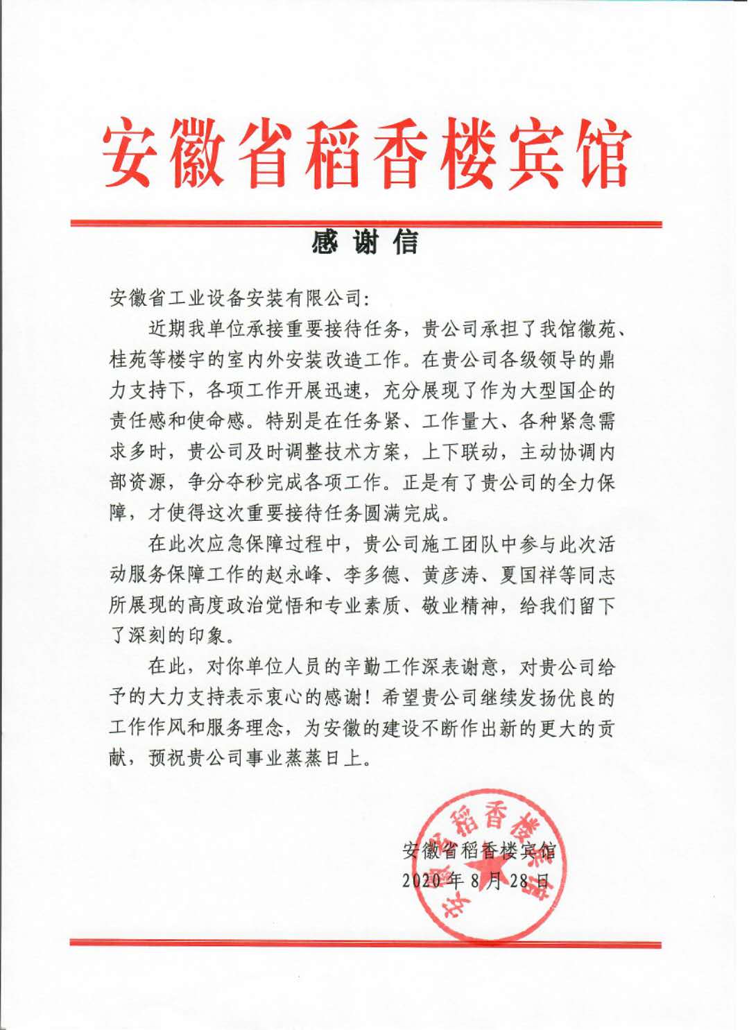 為此,稻香樓賓館發(fā)來(lái)的一封感謝信,感謝安徽安裝公司在近期承擔(dān)的稻香樓賓館室內(nèi)外安裝改造工程任務(wù)中,啟動(dòng)迅速、保障有力、方案得當(dāng)、上下聯(lián)動(dòng);通過(guò)日夜搶工奮戰(zhàn),爭(zhēng)分奪秒地完成各項(xiàng)工作,充分發(fā)揮國(guó)企擔(dān)當(dāng)?shù)闹厝巍?/span>