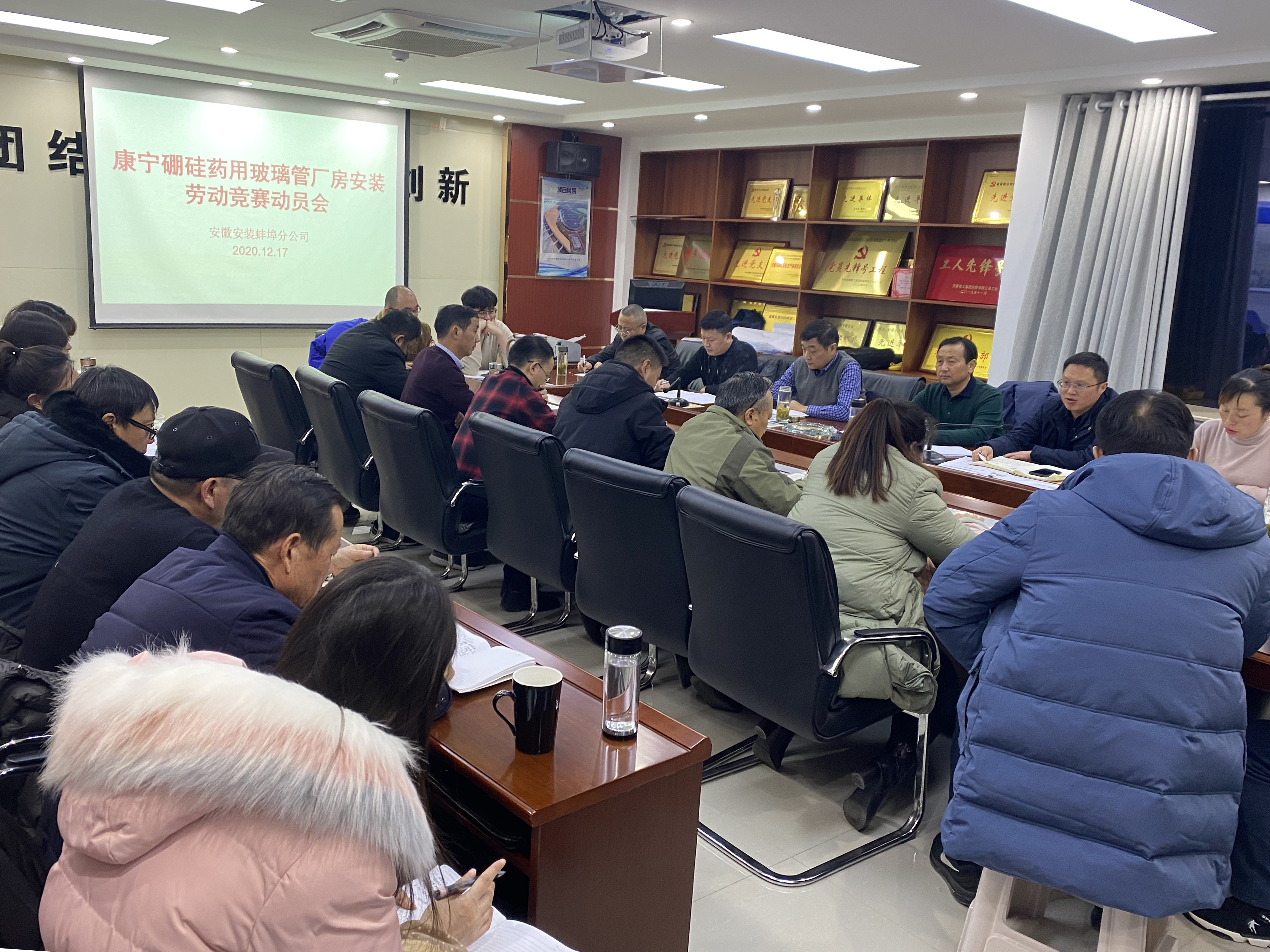 為加快推動(dòng)康寧硼硅醫(yī)用玻璃項(xiàng)目全面快速達(dá)產(chǎn),充分調(diào)動(dòng)員工工作的主動(dòng)性和積極性,貫徹落實(shí)集團(tuán)公司“戰(zhàn)疫情、搶工期、保目標(biāo)、促超產(chǎn)”為主題的勞動(dòng)競賽活動(dòng)精神,12月17日晚,蚌埠分公司召開康寧項(xiàng)目“大干100天,決戰(zhàn)3.31”的勞動(dòng)競賽動(dòng)員會。公司副總經(jīng)理、現(xiàn)場施工管理指揮部副指揮長劉安?。ǔ?wù))和高飛,公司工程管理部、經(jīng)營部、物資部、招標(biāo)辦、紀(jì)檢監(jiān)察室負(fù)責(zé)人及分公司領(lǐng)導(dǎo)班子成員、參戰(zhàn)項(xiàng)目管理人員及分公司機(jī)關(guān)全體人員30余人參加會議。