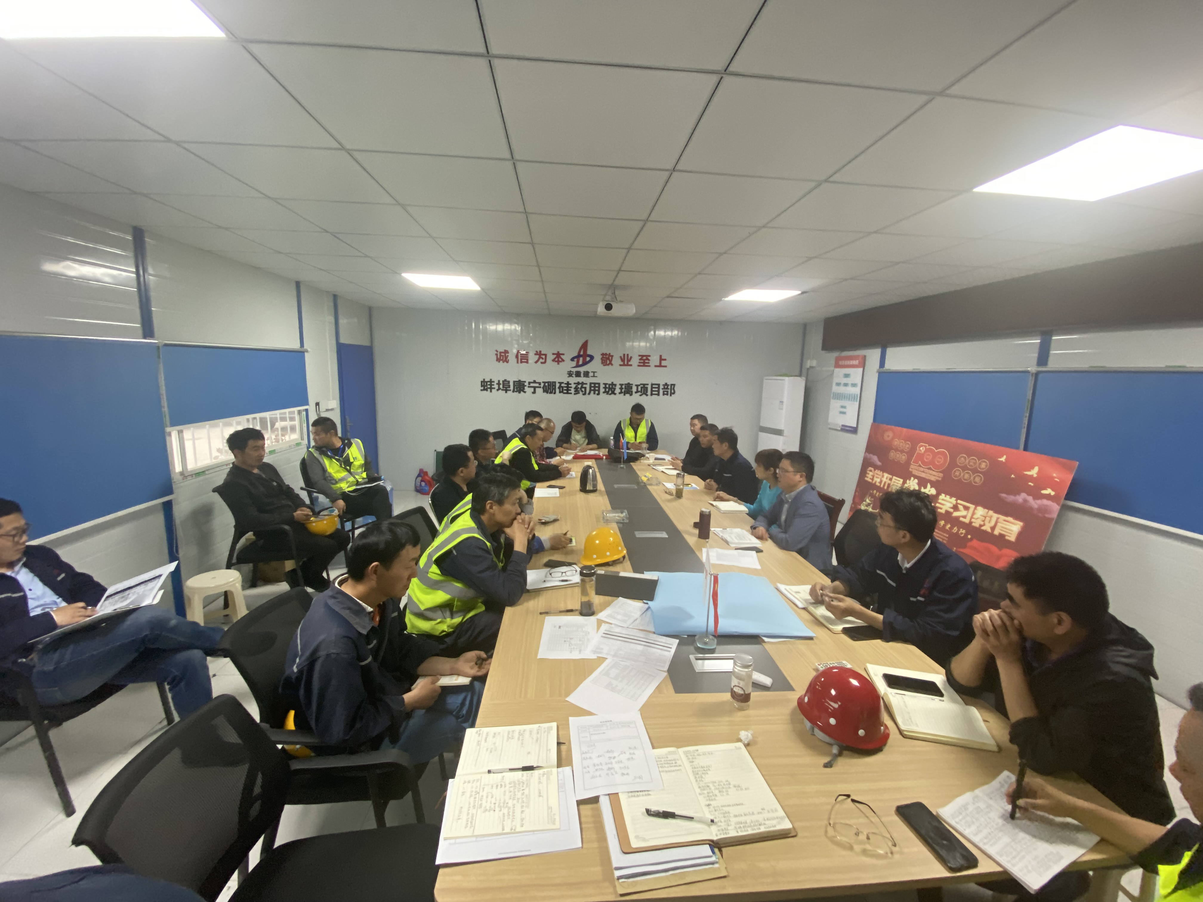 5月18日,雖然已是晚間八點(diǎn)多,但是位于蚌埠市中環(huán)線南、中糧大道以西的康寧藥用玻璃管項(xiàng)目現(xiàn)場(chǎng)到處是一片繁忙的景象。項(xiàng)目部會(huì)議室內(nèi)燈火通明,全體參戰(zhàn)人員正在召開項(xiàng)目協(xié)調(diào)推進(jìn)會(huì),而在不遠(yuǎn)處的施工現(xiàn)場(chǎng),機(jī)器設(shè)備聲轟鳴,百十名施工人員在各自的崗位上緊張而有序地忙碌著。