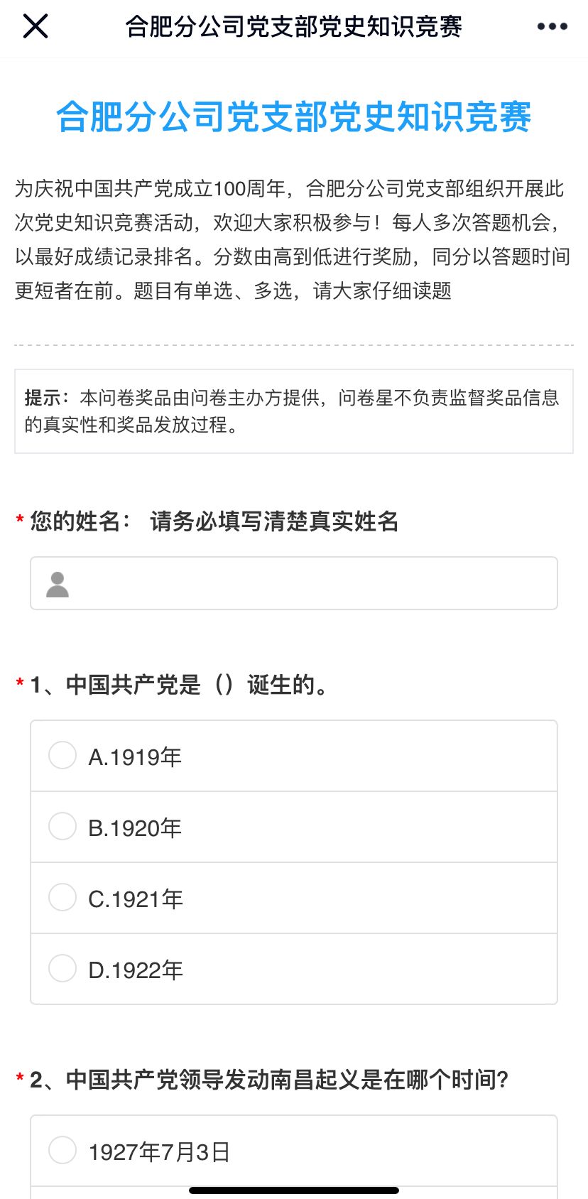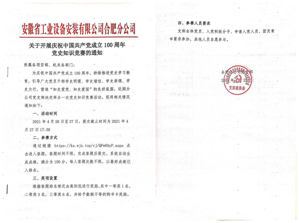 為慶祝中國(guó)共產(chǎn)黨成立100周年,持續(xù)推進(jìn)黨史學(xué)習(xí)教育,引導(dǎo)分公司黨員干部學(xué)史明理、學(xué)史增信、學(xué)史崇德、學(xué)史力行,營(yíng)造“知史愛黨、知史愛國(guó)”的良好氛圍,4月26日-27日,合肥分公司黨支部組織開展了黨史學(xué)習(xí)教育知識(shí)競(jìng)賽活動(dòng)。