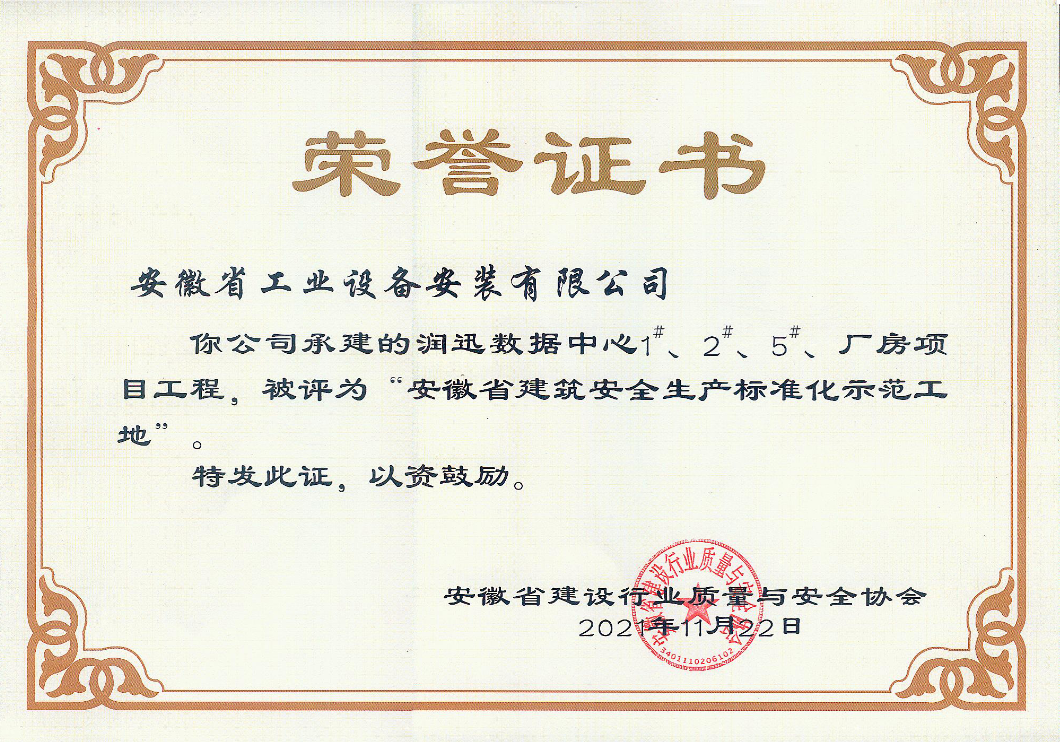 近日,安徽省工業(yè)設(shè)備安裝有限公司承建的潤迅數(shù)據(jù)中心1#、2#、5#廠房項(xiàng)目工程榮獲2021年度“安徽省建筑安全生產(chǎn)標(biāo)準(zhǔn)化示范工地”榮譽(yù)稱號(hào)。
