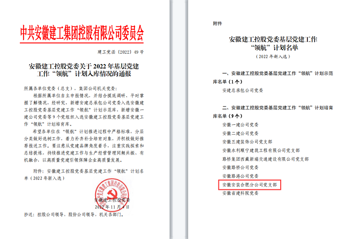 經(jīng)過前期充分準(zhǔn)備以及集團(tuán)嚴(yán)格篩選研究,安徽安裝合肥分公司黨支部于近日成功入選集團(tuán)基層黨建工作“領(lǐng)航”計(jì)劃培育庫。下一步,合肥分公司黨支部將以此為契機(jī),注重實(shí)踐探索和總結(jié)提煉,大力開展黨建品牌建設(shè),并充分發(fā)揮榜樣示范作用,帶動(dòng)更多的黨支部能有機(jī)會(huì)入選“領(lǐng)航”計(jì)劃培育庫,持續(xù)推進(jìn)公司黨建工作與生產(chǎn)經(jīng)營管理同頻共振、有機(jī)融合,以高質(zhì)量黨建引領(lǐng)保障企業(yè)高質(zhì)量發(fā)展。