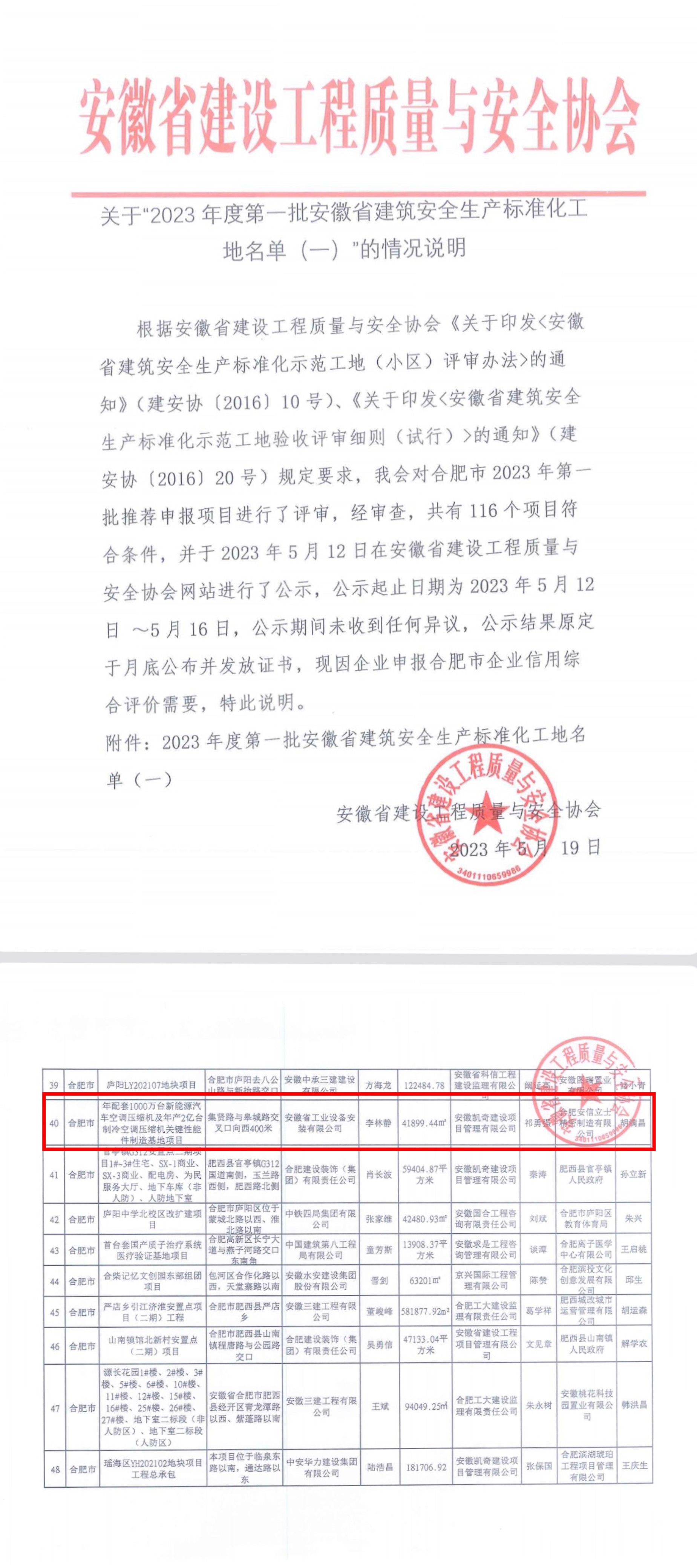 此次成功獲得“安徽省建筑安全生產(chǎn)標(biāo)準化工地”榮譽,是對肥西安信立士項目安全、質(zhì)量等項目管理工作的充分肯定和認可。在后續(xù)施工過程中,項目部將堅持把安全管理工作放在首位,持續(xù)加強安全文明標(biāo)準化建設(shè),不斷提升項目安全管理水平,拉高標(biāo)桿,再接再厲,為打造施工精品工程而不懈努力。