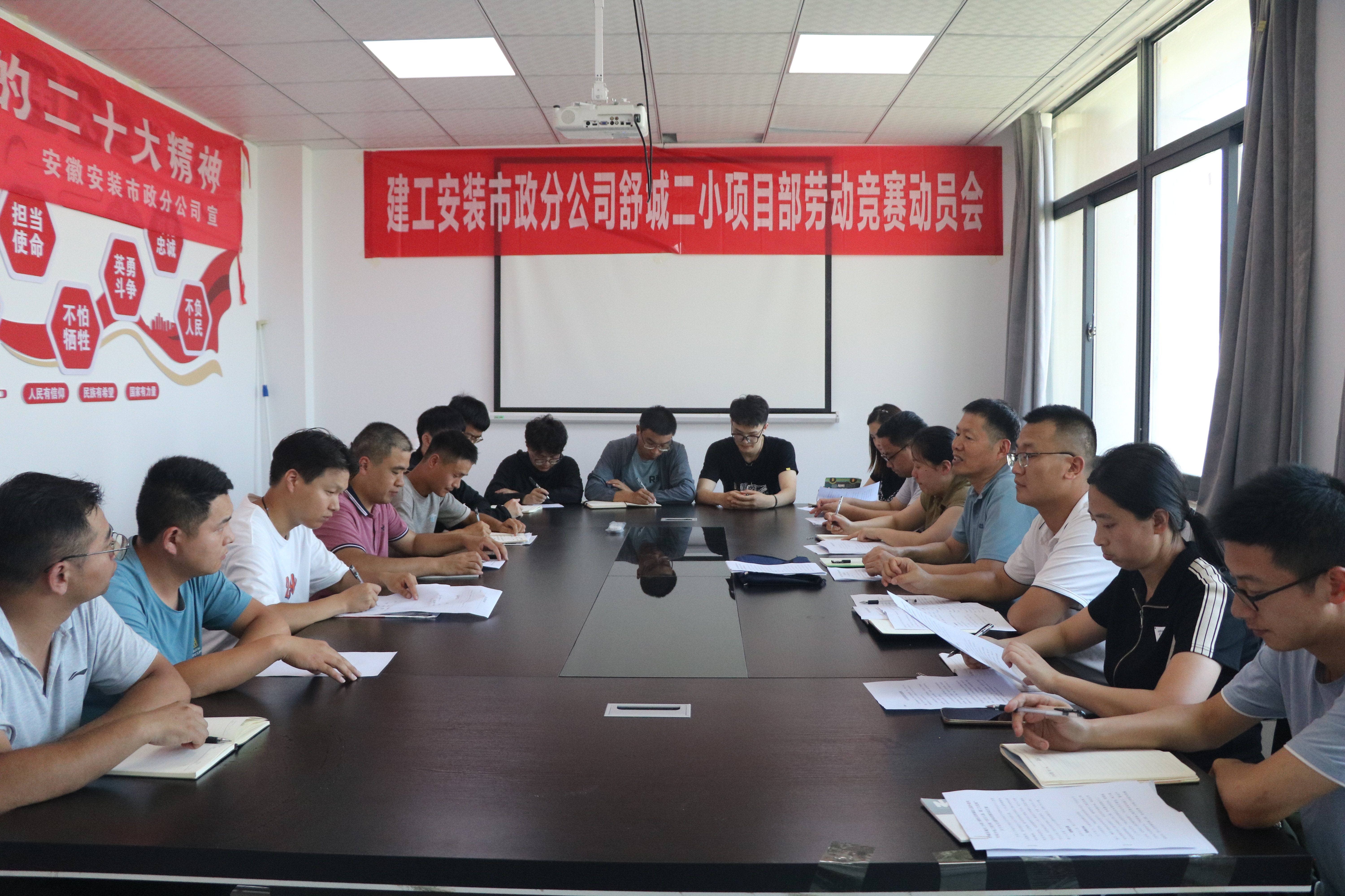 7月10日上午,市政分公司舒城縣城關(guān)二小緯二路校區(qū)及附屬幼兒園項目部舉行勞動競賽動員會,并組織開展勞動競賽大討論,正式拉開項目部“當好主人翁,建功大發(fā)展”大干20天,全面完成室外強電專業(yè)分包工程施工任務主題勞動競賽活動序幕。分公司黨支部書記胡迎東、副經(jīng)理解保及分公司勞動競賽領(lǐng)導小組成員出席會議,項目部全體管理人員及施工班組代表參會。會議由分公司工會副主席張曼主持。