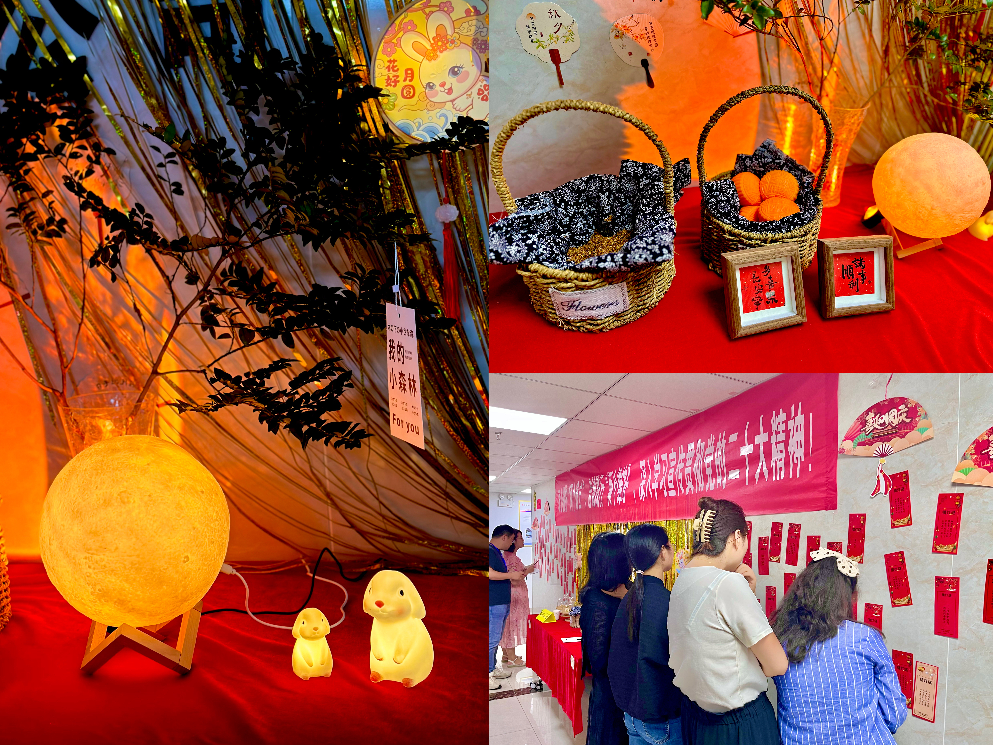 分公司工會(huì)購(gòu)置月亮燈、玉桂兔、綠植、桂花籃、燈籠、貼畫(huà)等各種裝飾物,把整個(gè)分公司裝扮得喜慶又熱鬧,擺放各式月餅、綠豆糕等供大家品嘗。舉辦“猜燈謎”小游戲,在分公司背景墻貼上“燈謎”小卡片,大家紛紛駐足觀賞、熱情參與,節(jié)日氣氛值瞬間拉滿。