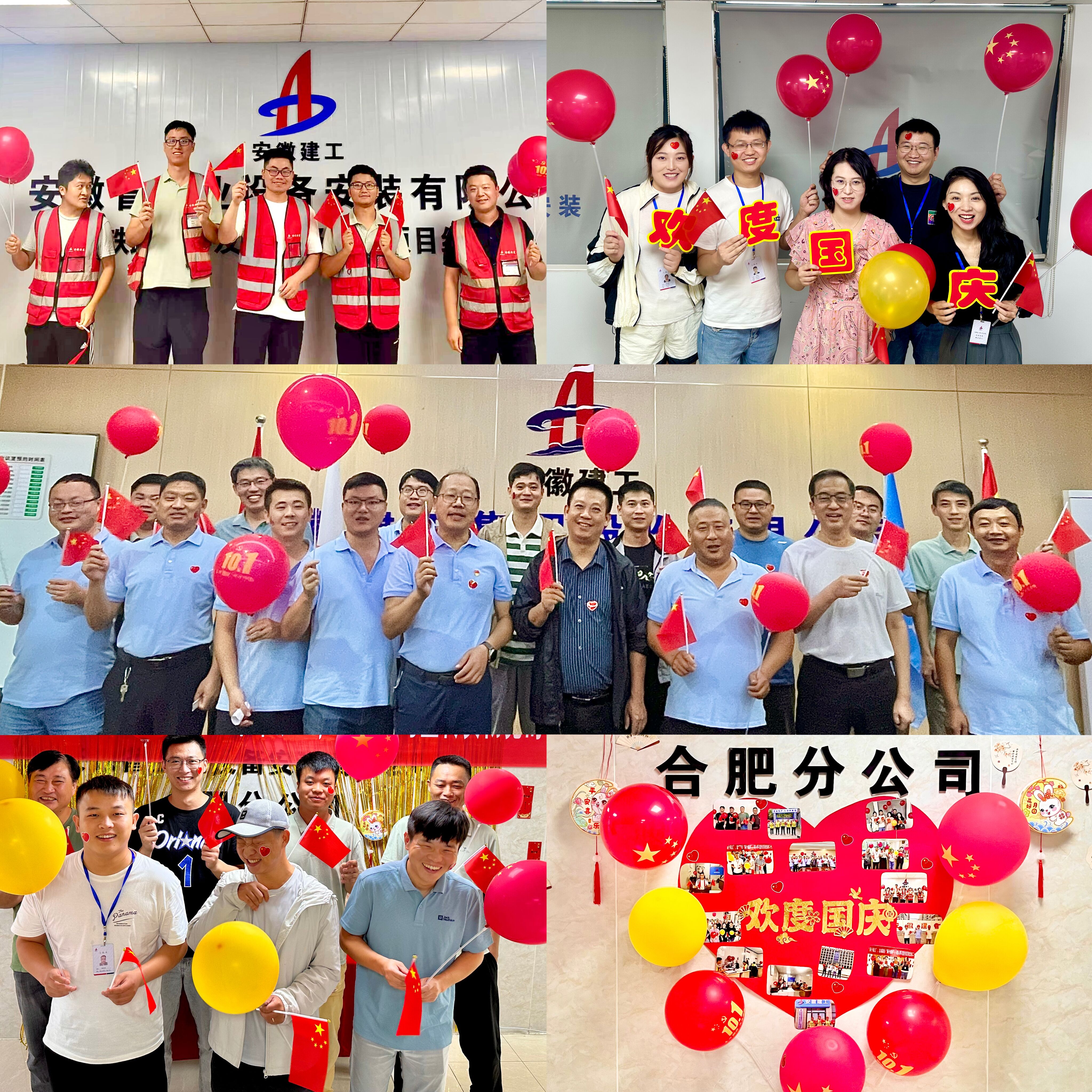 分公司機(jī)關(guān)和各項(xiàng)目部人員手持國(guó)旗、氣球和祝福標(biāo)語(yǔ),共同拍攝集體大合照為祖國(guó)母親獻(xiàn)上生日祝福,他們臉上的“一抹紅色”在燦爛笑容的映襯下顯得更加明亮耀眼。大家的合照被紅色的“心”連在一起,象征著和祖國(guó)母親心連心、同歡樂(lè),共團(tuán)圓。