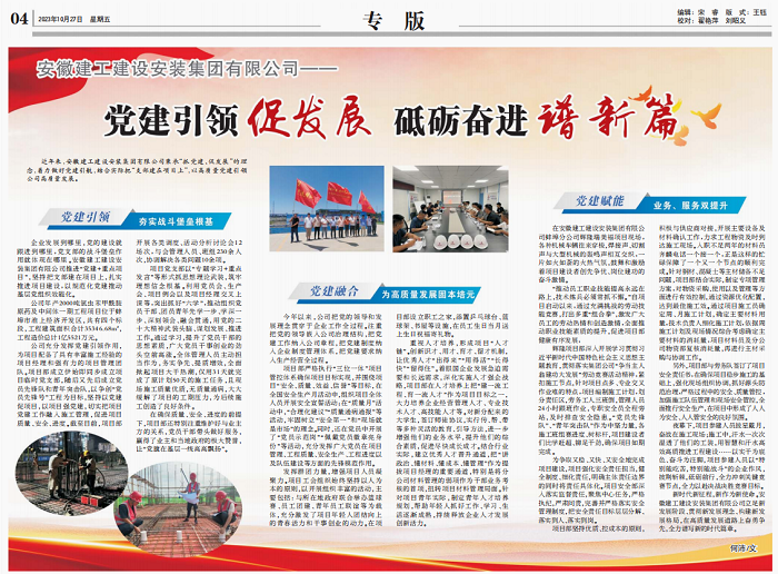 近年來(lái),安徽建工建設(shè)安裝集團(tuán)有限公司秉承抓黨建促發(fā)展的理念,著力做好黨建領(lǐng)航,結(jié)合實(shí)際把支部建在項(xiàng)目上,以高質(zhì)量黨建引領(lǐng)公司高質(zhì)量發(fā)展。