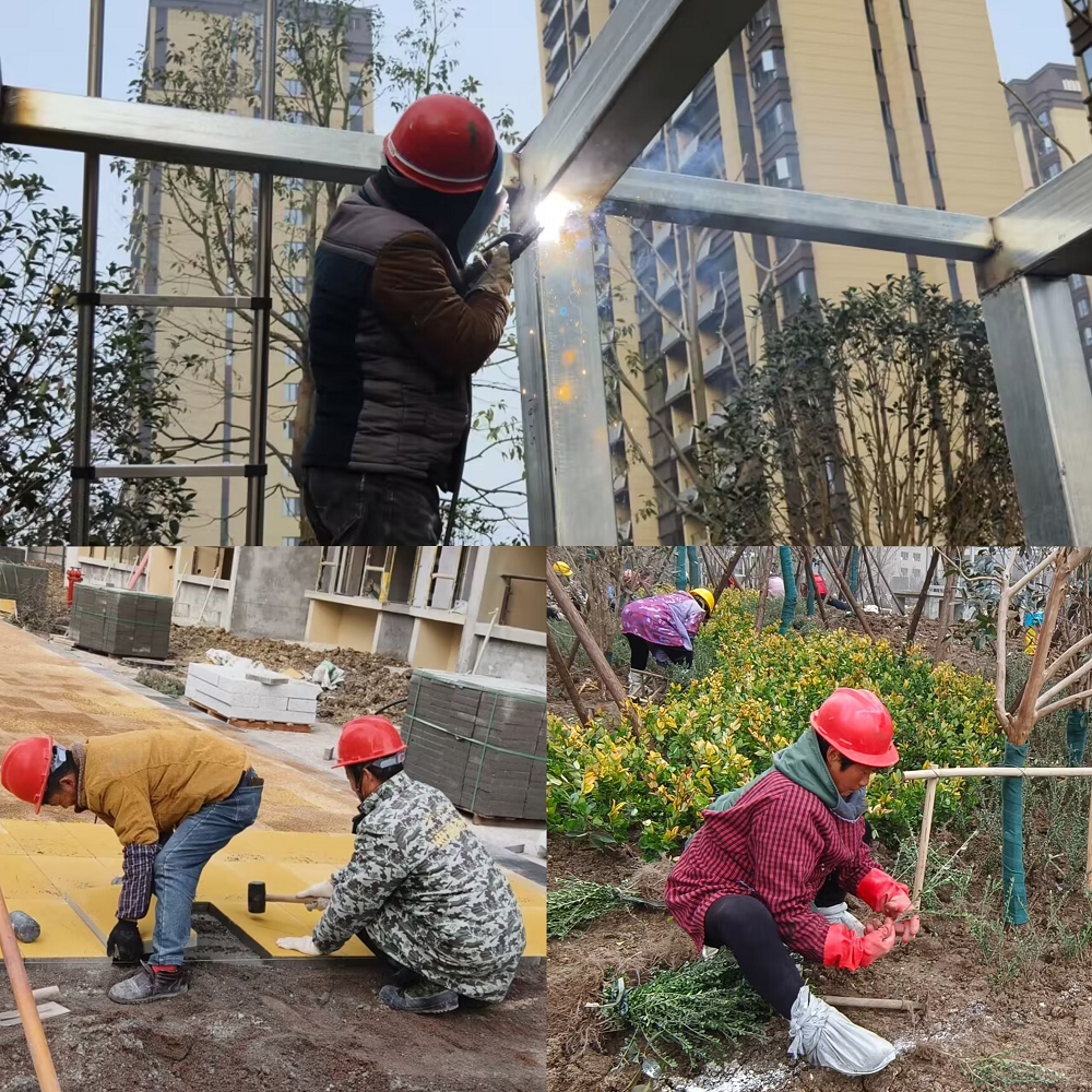 圖為:舒城縣青墩小區(qū)項目坡道鋼結(jié)構(gòu)雨棚焊接、人行道鋪裝及綠化種植施工