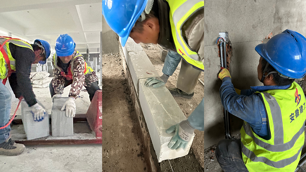 圖為:安徽理工大學(合肥高等研究院)維修改造項目(二期)室內(nèi)砌筑材料搬運、新增隔墻砌筑及水電管線預埋施工