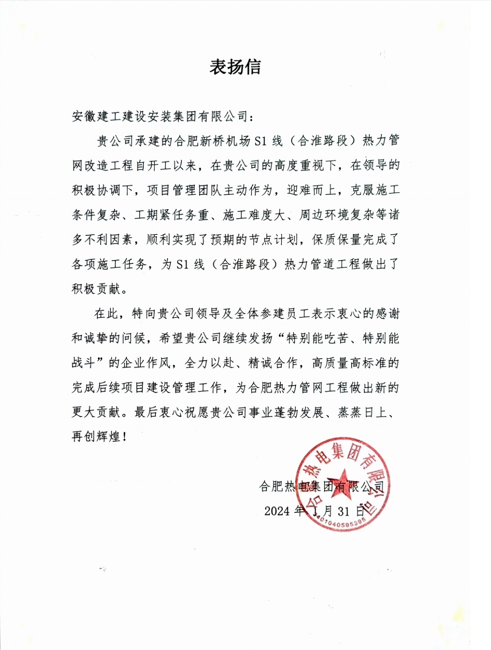 1月31日,合肥熱電集團(tuán)有限公司發(fā)來(lái)表?yè)P(yáng)信,就建工安裝集團(tuán)對(duì)合肥新橋機(jī)場(chǎng)S1線(合淮路段)熱力管網(wǎng)改造工程做出的積極貢獻(xiàn)予以充分肯定和真摯謝意。
