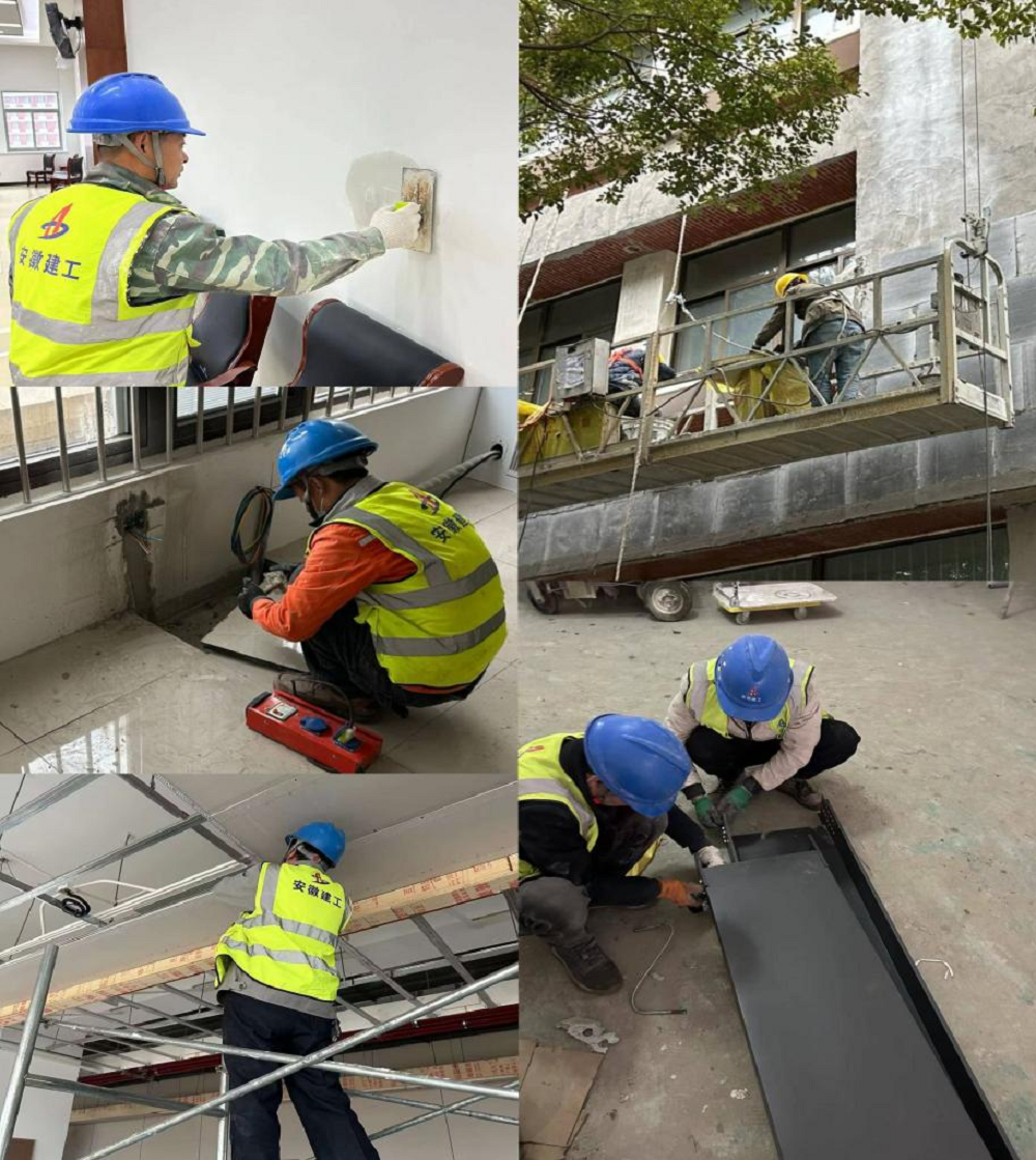 建工安裝滁州分公司安徽理工大學(xué)維修改造項(xiàng)目(二期)位于合肥市長(zhǎng)豐縣雙鳳路與鳳霞路交口,施工內(nèi)容主要為對(duì)已有實(shí)訓(xùn)樓、產(chǎn)教融合樓、綜合服務(wù)中心、生活服務(wù)次中心四個(gè)單體合計(jì)約3萬(wàn)平方米的維修、改造、安裝以及室外附屬工程給排水、景觀、鋪裝、綠化等。目前,通過(guò)項(xiàng)目全體員工夜以繼日、分秒必爭(zhēng)的奮斗,生活服務(wù)次中心已基本完工,實(shí)訓(xùn)樓施工完成約60%,產(chǎn)教融合樓施工完成約70%,綜合服務(wù)中心完成約75%,外墻真石漆及屋面保溫完成約50%。