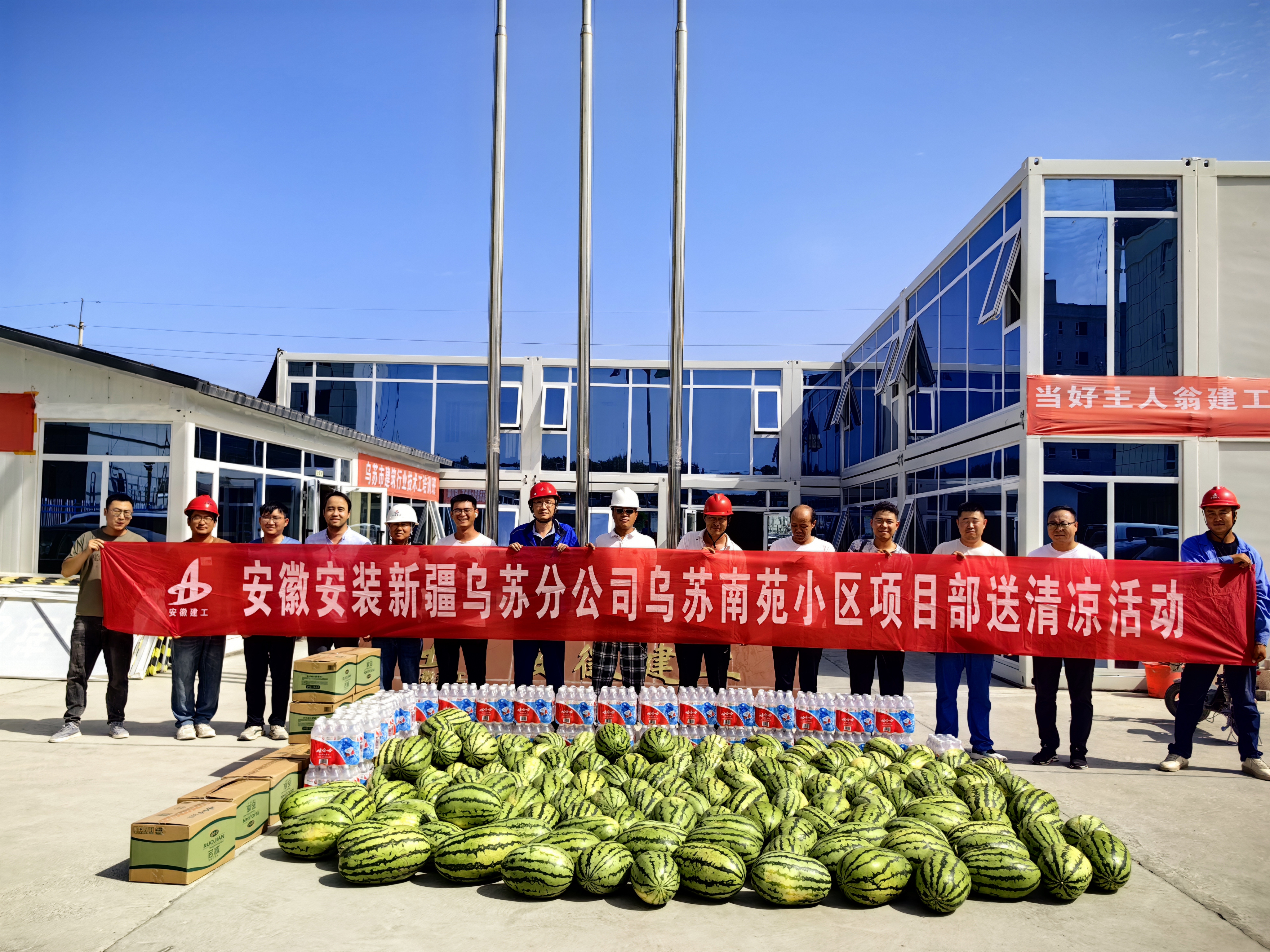 炎炎夏日,驕陽似火。近日,隨著新疆地區(qū)氣溫的逐漸攀升,建工安裝新疆烏蘇分公司工會赴烏蘇南苑新城項目部開展“送清涼”慰問活動。為了幫助員工保持良好的工作狀態(tài),分公司工會將精心準(zhǔn)備的西瓜、礦泉水等夏日清涼物資送往施工現(xiàn)場,為參建員工們帶來絲絲清涼和關(guān)懷。