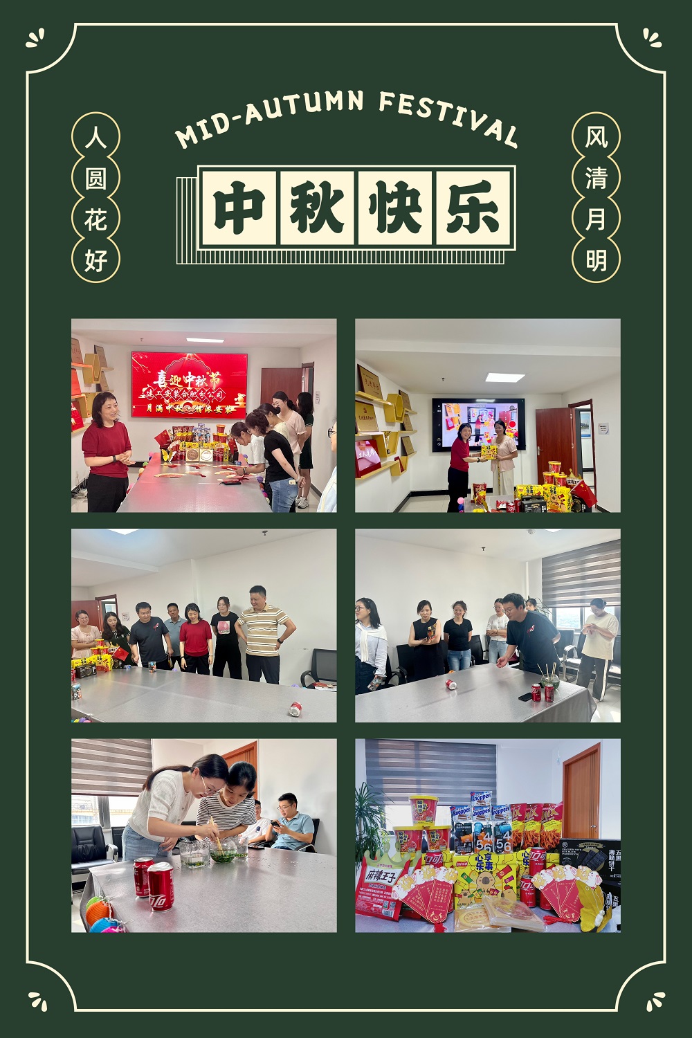通過(guò)精心布置,活動(dòng)現(xiàn)場(chǎng)喜氣洋洋。散發(fā)柔和光輝的月球燈、靈動(dòng)可愛(ài)的兔子燈、絢麗多彩的紙藝花、璀璨閃爍的燈帶以及精美別致的貼畫(huà),皆是員工們親手制作。這些作品均飽含著員工們的巧思與用心,每一處細(xì)節(jié)都彰顯著他們對(duì)中秋國(guó)慶雙節(jié)的深深祝福和對(duì)美好生活的熱愛(ài)。