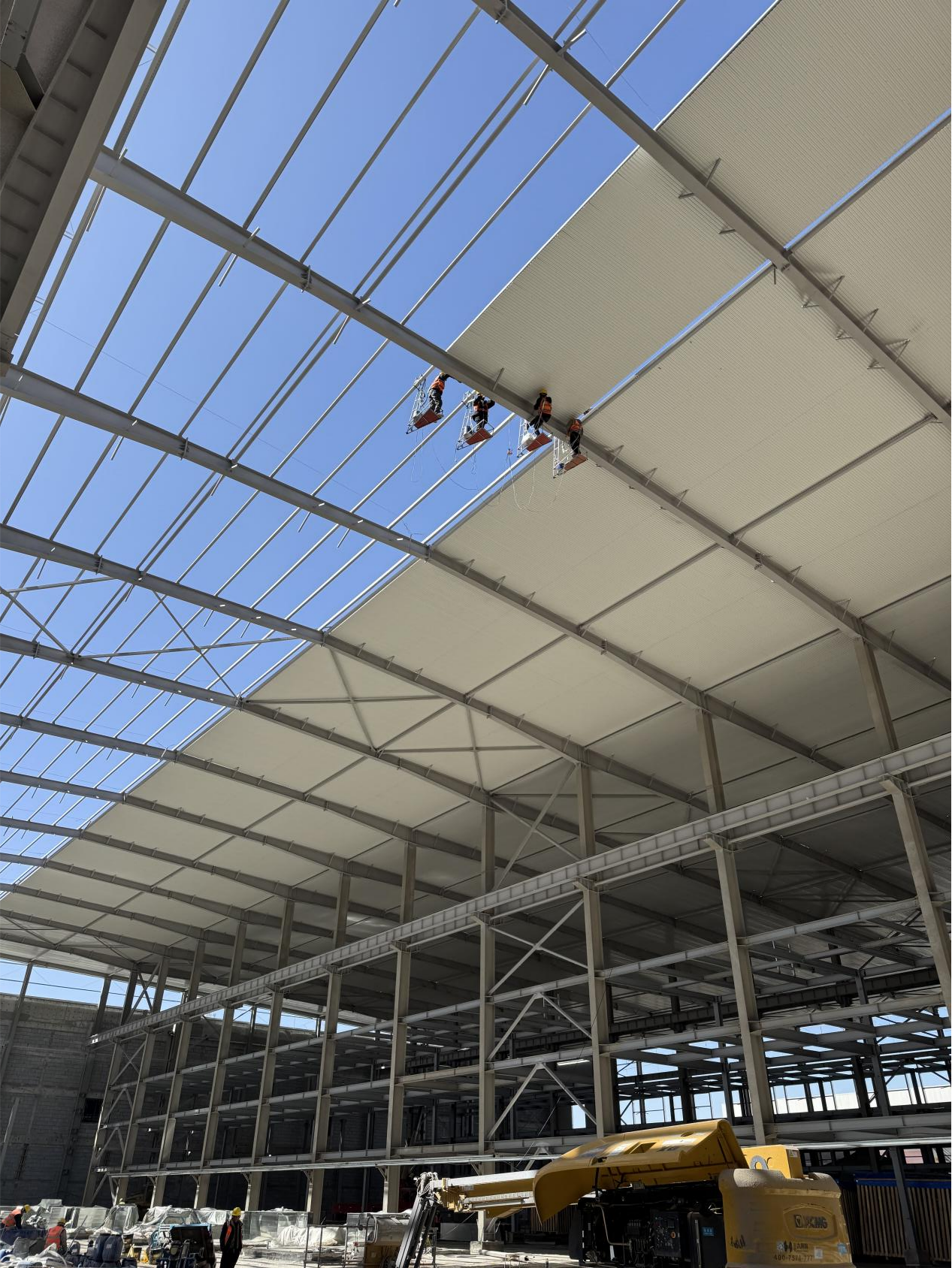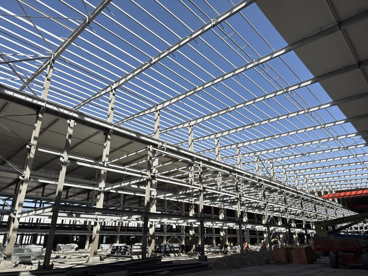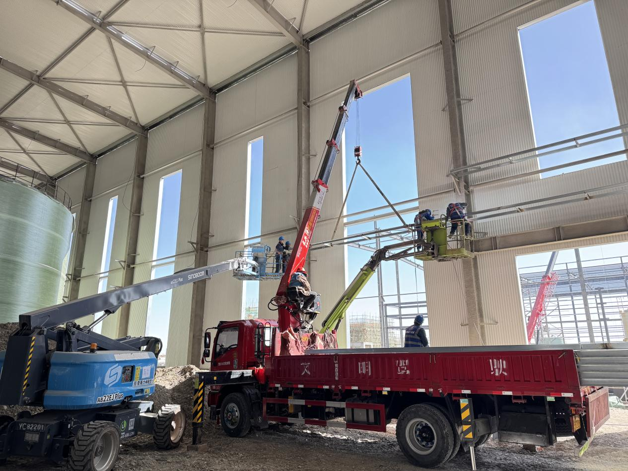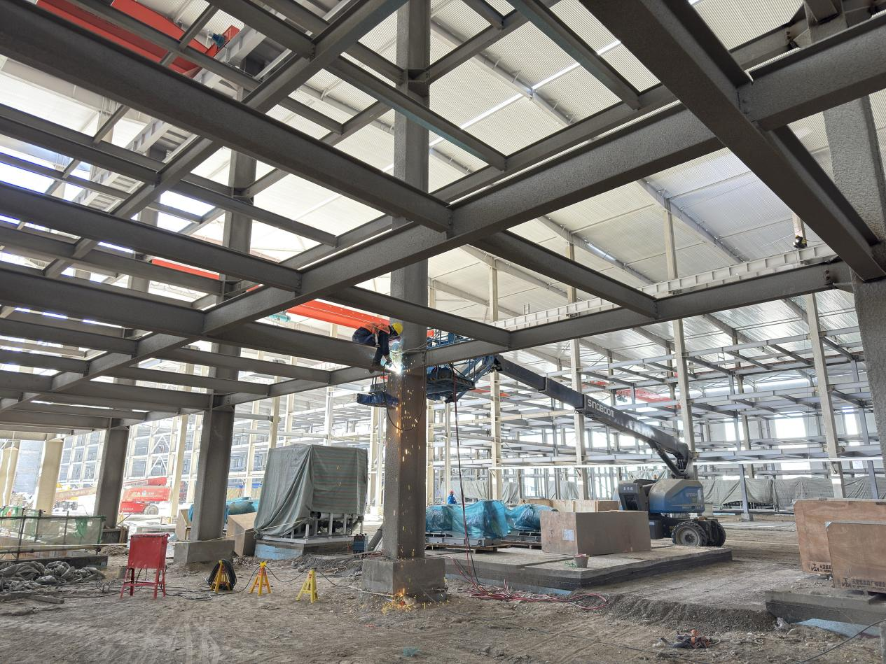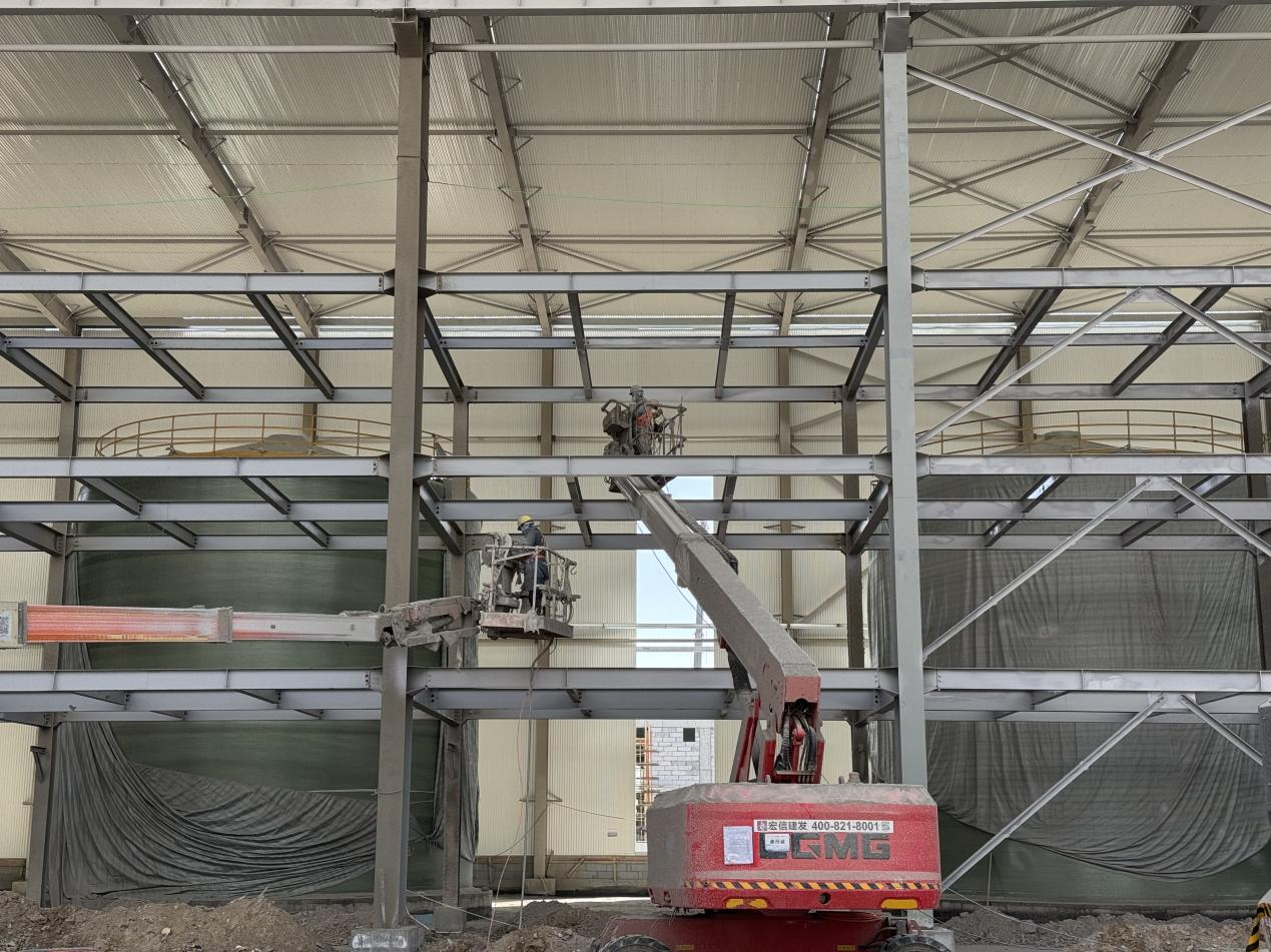 項目地處高海拔鹽湖區(qū),缺氧且淡水匱乏,施工環(huán)境惡劣,資源保障困難。面對不利因素,項目團隊迎難而上,積極尋找解決方案,為項目順利推進筑牢基礎。截至目前,項目已取得顯著階段性成果,廠房主鋼構全部完成,管廊鋼結構完成約95%,防火涂料完成80%,屋面及墻面圍護結構完成約50%,配電房裝飾裝修工作有序進行,各項任務按計劃穩(wěn)步推進。