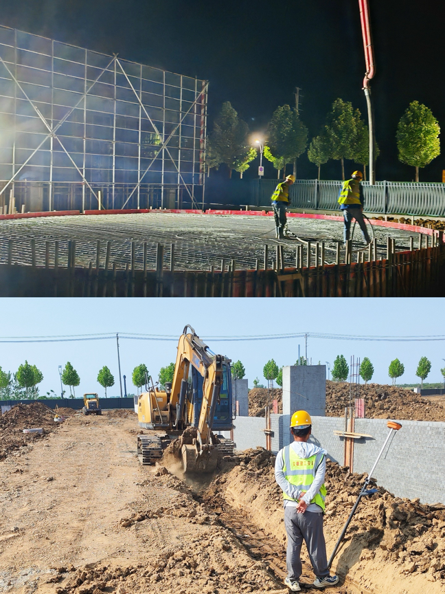 圖為明光科順涂料智能化生產(chǎn)基地項目筏板基礎(chǔ)混凝土澆筑、管道溝槽開挖