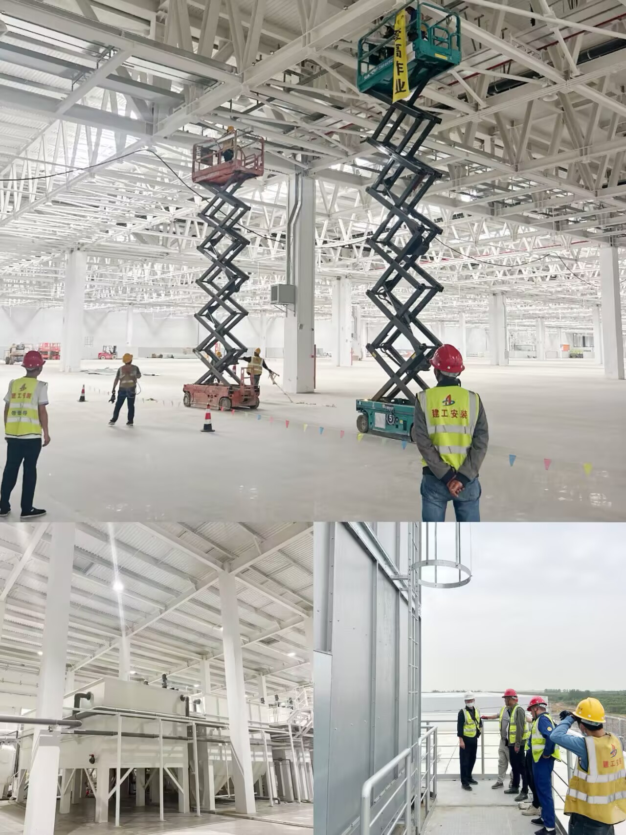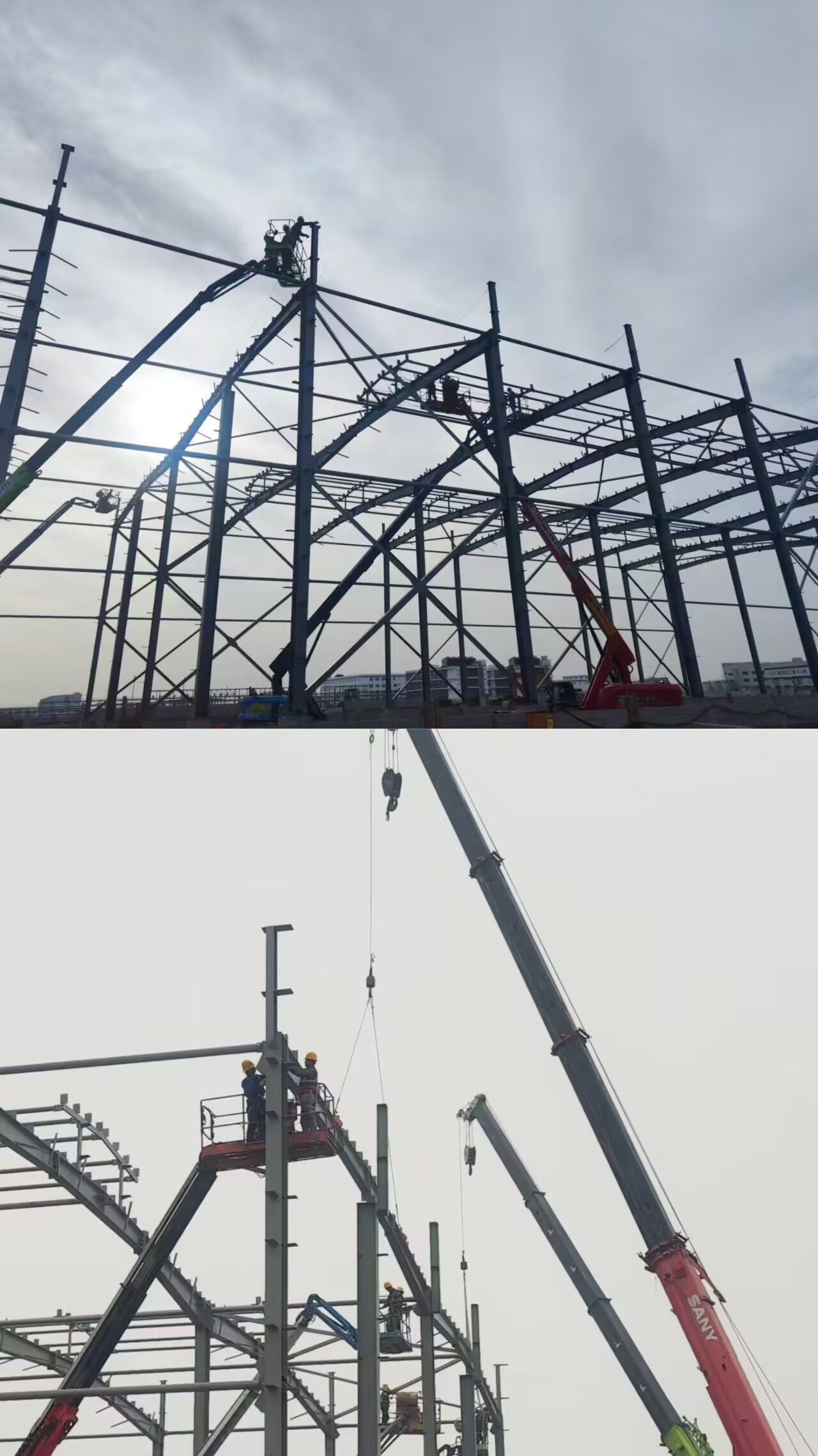 走進項目施工現(xiàn)場,起重機揮動著粗壯的鋼鐵臂膀劃破天際,將一段段鋼梁精準的吊裝至安裝位,曲臂車托舉著工人將鋼構(gòu)件嵌入到預定位置,保障高空作業(yè)人員的生命安全。這是力量與技術(shù)的二重奏,更是安全與效率的完美平衡,一幅現(xiàn)代工業(yè)建筑的壯美畫卷正徐徐展開。